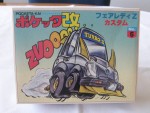 einfacher, ungebauter, älterer und kompletter Plastik-Bausatz, in Original-Schachtel mit Baubeschreibung und in Folie eingeschweisst. Kann als Fantasie-Fahrzeug aus einer Manga-Serie Pocketa-kai mit 2 Haifischzähnen auf der Motorhaube, mit mitgeliefertem Pull-Back-Antrieb, gebaut werden. Fahrzeug wie Takara-Choro-Q mit verzerrter Karosserie