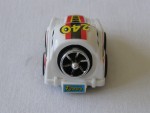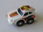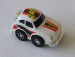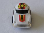 schwarze, nicht durchsichtige Scheiben. Chrom Frontstossstange und Schwungrad im Heck, wirksam auf die Vorderräder. Rot-schwarz-gelbe Kleber auf dem Dach, den Seiten und der Motorhaube mit den Aufdrucken "240". Zudem ein blau-gelber Kleber im Heck, mit dem Aufdruck "Turbo". Chrom-4-Steg-Felgen mit Gummireifen