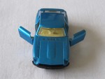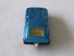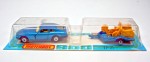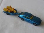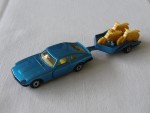 durchsichtige Scheiben, hellgelbes Interieur. Zu öffnende Türen. Mattschwarze Bodenplatte und Stossstangeneinheit. Chrom-5-Doppelsteg-Felgen mit Hartplastikräder. Fahrzeug vom Superfast Set aus England-Produktion, als Original-Gespannkombination mit blauem, 1-achsigem Anhänger mit 3 gelben Motorrädern |