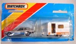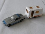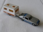 | Massstab | 1:60 |  durchsichtige Scheiben, schwarzes Interieur. Nicht zu öffnende Türen. Auf der Motorhaube den Seiten und dem Dach blau-hellblaue Streifen. Schwarz gelänzende Bodenplatte und Stossstangeneinheit. Chrom-5-Doppelsteg-Felgen mit Hartplastikräder. Fahrzeug vom Superfast Set aus England-Produktion, als Original-Gespannkombination mit weiss-braunem "Mobile 500" Wohnwagen-Anhänger