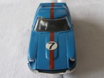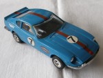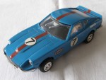| Massstab | 1:32 |  durchsichtige Scheiben, schwarzes Interieur und Kühlergrill mit weiss-gelber Fahrerfigur, als rechtslenker Fahrzeug. Chrom Stossstangen und Scheinwerfer. Über dem ganzen Auto ein roter Streifen sowie ein weisser Kreis mit der schwarzen Startnummer 7 auch auf den Seiten, zusammen mit Werbeaufklebern. Fahrzeug für die elektrische Schlitz-Rennbahn. Chrom-5-Steg-Felgen mit Gummi-Reifen