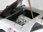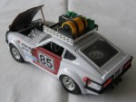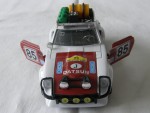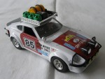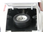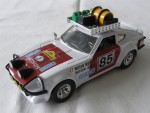durchsichtige Scheiben, schwarzes Interieur. Aufgesetzte Kotflügelverbreiterungen, Heck- und Frontspoiler in Wagenfarbe. Zu öffnende, rote Türen, rote Motorhaube mit Motorapplikation und Heckklappe mit Reserverad im Kofferraum. Auf dem Dach ein verchromter Gepäckträger mit Ersatzteilen und Benzinkanistern, (komplett). Einem Rallyfahrzeug nachempfunden, mit schwarzem Front- und Heckschutz und Zusatzscheinwerfern auf der Motorhaube (2), Suchscheinwerfer vor der A-Säule rechts und dem Frontschutz (3) sowie diversen Werbeaufklebern und der Startnummer 85. Kolorierte Lichter. Chrom-6-Steg-Felgen mit Hartplasikräder
