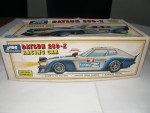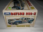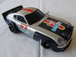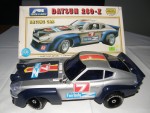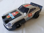 schwarze, nicht durchsichtige Scheiben, Heckblende und Motorhaube mit 2 Zusatzscheinwerfern. Dunkelblaue Kotflügelverbreiterungen und Front- und Heckspoiler. Chrom Stossstangen und Suchscheinwerfer links vor der A-Säule, als "an-aus" Schalter für den Fahrbetrieb. Über dem ganzen Auto ein rot-weiss-gelber Streifen mit der Startnummer 7 sowie ein blauer Balken mit dem weissen Aufdruck "Fairlady Z". Auf den Seiten die rot-weisse Startnummer 7 und den blauen Balken mit dem weissen Aufdruck "Fairlady Z". Kolorierte Lichter mit Glasabdeckungen auf den Schweinwerfern. Batteriebetriebener Fahrbetrieb. Schwarze 6-Steg-Felgen mit lenkbaren Hartplastikräder