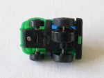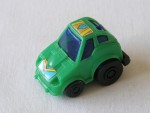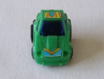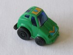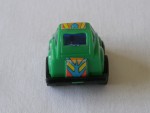 blaue, nicht durchsichtige Scheiben und schwarze Stossstange hinten. Einfaches Kunststoffmodell mit blau-orangen-roten Aufklebern. Schwarze Scheiben-Felgen mit Hartplastikräder und mit Schwungrad-Antrieb |