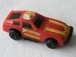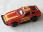 | Massstab | 1:60 |  schwarze, nicht durchsichtige Scheiben. Angedeutete Targa-Dächer. Verschraubte Kunststoffbodenplatte-Stossstangen-Seitenauspuff-Einheit. Auf dem ganzen Kunststoff-Auto gelb-orange-rote Aufkleber, mit den weiss-roten Aufdrucken "Fairlady 280 ZX". Am Heck die Öffnung für die Abschussvorrichtung (fehlt). Schwarze 5-Steg-Felgen mit Hartplastikräder. Einfaches Billigmodellauto