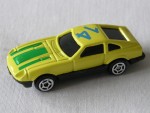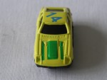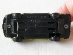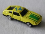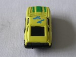 schwarze, nicht durchsichtige Scheiben. Vernietete Kunststoffbodenplatte-Rückleuchten-Stossstangen-Einheit. Auf der Motorhaube grüne Streifen. Auf dem Dach die blaue Startnummer 14. Chrom-5-Steg-Felgen mit Hartplastikräder. Einfaches Billigmodellauto |