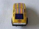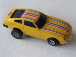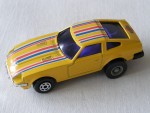 | Massstab | 1:58 |  bläuliche, nicht durchsichtige Scheiben. Chrom-Frontstossstange und Heckblende. Vernietete, mattschwarze Kunststoffbodenplatte-Stossstangen-Einheit. Entlüftungsgitter auf der Motorhaube und Stossschutzleisten auf den Seiten in Wagenfarbe. Auf der Motorhaube und  dem Dach weiss-blau-rote Streifen. Auf der Heckklappe den blau-rot-gelben Aufdruck "Nissan". Grössere Hinterräder mit Gummi-Reifen und Chrom-6-Steg-Felgen vorne, nicht durchbrochen, mit Hartplastikräder und Pull-Back-Antrieb