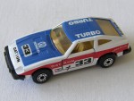 | Massstab | 1:58 |  durchsichtige Scheiben, cremefarbenes 2+2-Interieur. Zu öffnende Türen. Vernietete, mattschwarze Bodenplatte-Stossstangen-Einheit. Angedeutete Targa-Dächer. Naga-Öffnungen auf der Motorhaube und Stossschutzleisten auf den Seiten in Wagenfarbe. Dem SCCA-Rennfahrzeug des Bob Sharp Racing Teams nachempfunden, mit der legendären Startnummer 33 und Werbeaufdrucken. Chrom-5-Steg-Felgen, nicht durchbrochen, mit 5 Radbolzen und Hartplastikräder. Fahrzeug aus der Japan-Box-Serie