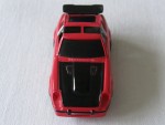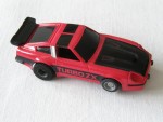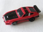 schwarze, nicht durchsichtige Scheiben, Schutznetz im linken Seitenfenster, Motorhaube, grosser, aufgesetzter Heckspoiler, Stossstangen und angedeutete Targadächer. Silberne B-Säule. Schwarzer Streifen auf den Seiten mit dem roten Aufdruck "Turbo ZX". Graue 5-Steg-Felgen mit Weichgummi-Reifen. Fahrzeug für die Slot-Rennbahn, samt Motor |