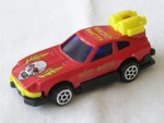 | Massstab | 1:45 |  blaue, nicht durchsichtige Scheiben. Schwarze, vernietete Bodenplatte mit Seitenauspuffanlage beidseits, Stossstangen-Boost-Öffnung-Rückleuchten-Einheit hinten. An der Front gelbe, ausfahrbare Zangen und auf der Heckklappe doppelte Raketenantriebs-Booster. Fantasie Auto, einem 280 ZX nachempfunden. Auf der Motorhaube ein gelb-geflügelter, weiss-schwarzer Totenkopf. Auf den Seiten und dem Dach gelb-goldener Aufdruck "Magic Master". Chrom-6-Steg-Felgen, nicht durchbrochen, mit Gummi-Reifen und Pull-Back-Antrieb