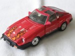 | Massstab | 1:38 |  durchsichtige Scheiben, inklusive Targa-Dächer, schwarzes Interieur mit Fahrerfigur, als Transformer. Naga-Öffnungen auf der Motorhaube und Rückspielgel an der A-Säule montiert in Wagenfarbe. Zu öffnende Türen. Schwarze Stossstangen-Bodengruppe. Auf der Motorhaube ein orange-gelb-schwarzer Flammenaufkleber. Auf den Seiten die weissen Aufkleber mit dem Aufdruck "Fairlady 280 ZX T-Bar-Roof". Kolorierte Lichter. Chrom-4-Steg-Original-Felgen mit Gummi-Reifen. Fahrzeug kann als Roboter-Figur umgebaut werden