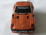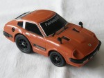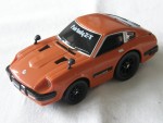| Massstab | 1:34 |  schwarze, nicht durchsichtige Scheiben und angedeuteten Scheibenwischern, mit verzerrter Karossserie, Entlüftungsgitter auf der Motorhaube, Stossschutzleisten auf den Seiten, Tankdeckel, Stossstangen und Rückspiegel auf den Kotflügeln montiert. Auf der Frontscheibe den weissen Aufdruck "Fairlady Z-T". Auf den Seiten ein weisser Aufdruck "Fairlady 280 Z". In silber eingefärbte B-Säule, Scheibenrahmen und Türgriffe. Kolorierte Lichter. Strassenfahrzeug für den Japanischen Markt. Schwarze 8-Steg-Felgen mit Profilgummi-Reifen und Pull-Back-Antrieb. Fahrzeug aus einem 9-teiligen Set dieses Fahrzeugs mit Originalfarben