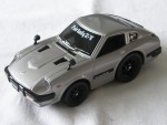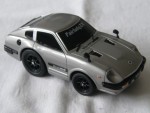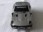 | Massstab | 1:34 |  schwarze, nicht durchsichtige Scheiben und angedeuteten Scheibenwischern, mit verzerrter Karossserie, Entlüftungsgitter auf der Motorhaube, Stossschutzleisten auf den Seiten, Tankdeckel, Stossstangen und Rückspiegel auf den Kotflügeln montiert. Auf der Frontscheibe den weissen Aufdruck "Fairlady Z-T". Auf den Seiten ein weisser Aufdruck "Fairlady 280 Z". In silber eingefärbte B-Säule, Scheibenrahmen und Türgriffe. Kolorierte Lichter. Strassenfahrzeug für den Japanischen Markt. Schwarze 8-Steg-Felgen mit Profilgummi-Reifen und Pull-Back-Antrieb. Fahrzeug aus einem 9-teiligen Set dieses Fahrzeugs mit Originalfarben
