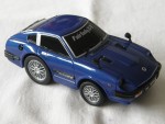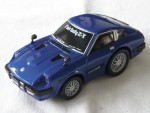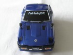 | Massstab | 1:34 |  schwarze, nicht durchsichtige Scheiben und angedeuteten Scheibenwischern, mit verzerrter Karossserie, Entlüftungsgitter auf der Motorhaube, Stossschutzleisten auf den Seiten, Tankdeckel, Stossstangen und Rückspiegel auf den Kotflügeln montiert. Auf der Frontscheibe den weissen Aufdruck "Fairlady Z-T". Auf den Seiten ein weisser Aufdruck "Fairlady 280 Z". In silber eingefärbte B-Säule, Scheibenrahmen und Türgriffe. Kolorierte Lichter. Strassenfahrzeug für den Japanischen Markt. Silberne 10-Doppel-Steg-Felgen mit Profilgummi-Reifen und Pull-Back-Antrieb. Fahrzeug aus einem 9-teiligen Set dieses Fahrzeugs mit Originalfarben