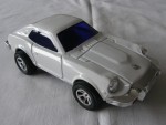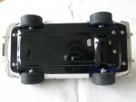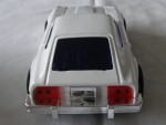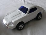 blaue, nicht durchsichtige Scheiben. Chrom Stossstangen und Scheinwerfer. Blechauto mit verzerrter Karosserie. Kolorierte Blinker-Rückleuchte. Chrom-6-Steg-Felgen mit Profilgummi-Reifen und Schwungrad-Antrieb |