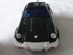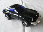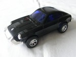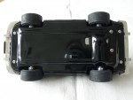 blaue, nicht durchsichtige Scheiben. Chrom Stossstangen und Scheinwerfer. Blechauto mit verzerrter Karosserie. Kolorierte Blinker-Rückleuchte. Chrom-6-Steg-Felgen mit Profilgummi-Reifen und Schwungrad-Antrieb