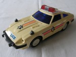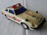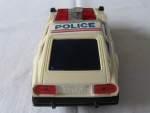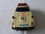 | Massstab | 1:19 |  blaue, nicht durchsichtige Scheiben. Schwarze Stossstangen, Rückspiegel auf den Kotflügeln montiert und verschraubte Bodenplatte. Entlüftungsgitter auf der Motorhaube und Stossschutzleisten auf den Seiten in Wagenfarbe. Auf der Motorhaube ein rot-blau-schwarz-weisser Aufkleber mit dem Aufdruck "Police" samt Hoheitszeichen. Auf den Seiten rot-blau-schwarze Aufkleber mit dem Aufdruck "Police" samt Hoheitszeichen. Auf dem Dach eine rote Lichtbar sowie ein weiss-blau-roter Aufkleber mit dem Aufdruck "Police". Glasscheinwerfer (links fehlt) und Heckleuchten. Batteriebetriebener Anstossmotor. Weisse 6-Steg-Felgen mit Hartplastikräder. Einfaches Plastikmodellauto mit leicht vergilbter Karosserie