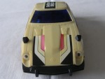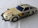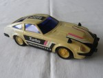 | Massstab | 1:19 |  blaue, nicht durchsichtige Scheiben. Schwarze Stossstangen, Rückspiegel auf den Kotflügeln montiert und verschraubte Bodenplatte. Entlüftungsgitter auf der Motorhaube und Stossschutzleisten auf den Seiten in Wagenfarbe. Auf der Motorhaube zwei schwarz-weiss-rot-gelbe Streifen. Auf den Seiten schwarz-weiss-gelb-rote Streifen mit dem Aufdruck "Turbo Datsun 280 ZX 2 + 2". Auf dem Dach ein schwarz-rot-gelber Aufkleber mit dem Aufdruck "Datsun 280 ZX. Kolorierte Lichter. Weisse 4-Steg-Felgen mit Hartplastikräder und Schwungrad-Antrieb. Einfaches Plastikmodellauto mit leicht vergilbter Karosserie aber komplett