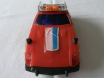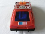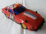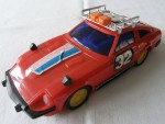 | Massstab | 1:19 |  blaue, nicht durchsichtige Scheiben. Schwarze Stossstangen, Rückspiegel auf den Kotflügeln montiert und verschraubte Bodenplatte. Entlüftungsgitter auf der Motorhaube und Stossschutzleisten auf den Seiten in Wagenfarbe. Auf der Motorhaube ein rot-blau-weisser Streifen. Auf den Seiten schwarz-weisse Aufkleber mit der Aufschrift "Datsun 280 ZX 2 + 2" sowie die schwarz-weisse Startnummer 32. Auf dem Dach ein Chrom-Dackgepäckträger mit Rally-Untensilien sowie einem Reserverad (fehlt). Weisse 4-Steg-Felgen mit Hartplastikräder und Schwungrad-Antrieb. Einfaches Plastikmodellauto mit vergilbten Rädern