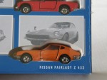 | Massstab | 1:60 |  durchsichtige Scheiben, schwarzes Interieur und zu öffnende Türen. Bodenplatte ist auch gleichzeitig die Stossstangen- Kühlergrill- Rückleuchteneinheit. Kolorierte Lichter und weitere Details wie Entlüftungsgitter auf der Heckklappe und Beschriftungen. Chrom 5-Steg-Felgen mit Hartplastikräder. Fahrzeug aus einem 2005-er Tomica 4-er-Set, zusammen mit einem weissen Toyota GT 2000, einem roten Honda S 800 Convertible (geschlossen) und einem weissen Mazda Cosmo Sport, komplett vorhanden