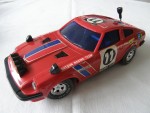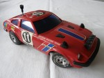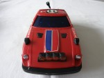 | Massstab | 1:18 |  blaue, nicht durchsichtige Scheiben. Schwarze Stossstangen, Entlüftungsgitter und Zusatzscheinwerfer auf der Motorhaube, Rückspiegel auf den Kotflügeln montiert und Wählhebel in der Heckscheibe für die Aktivierung der Aktionen. Chrom Lichter und Heckblende. Auf der Motorhaube ein blau-rot-weisser Streifen und den Aufdruck "Datsun Racing Team". Auf den Seiten blau-rot-weisse Streifen sowie die weiss-schwarze Startnummer 11 mit Aufdrucken "Datsun Racing Team" und Werbeaufdrucken. Auf dem Dach ein schwarz-weiss-roter Aufkleber mit der Startnummer 11, als Rallyfahrzeug in Anlehnung an das East-African-Rally-Auto. Batteriebetriebenes Funk-Fernsteuer Modellauto in der 27 Mhz Konfiguration. Lenkbare Chrom-5-Steg-Felgen im Wolfrace Design und Profilgummi-Reifen. Die Aufkleber weisen Gebrauchsspuren auf aber Fahrzeug ist komplett