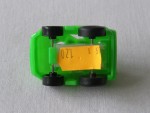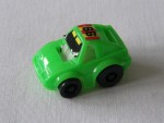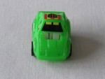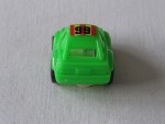 schwarz-gelbe, nicht durchsichtige Scheiben und angedeutete Targa-Dächer. Auf dem Dach ein rot-gelb-schwarzer Aufkleber mit der Startnummer 66. Einfaches Kunststoffmodellauto. Schwarze Scheibenräder mit Gummi-Reifen und Pull-Back-Antrieb. Baugleich wie die Choro Q Light-Serie