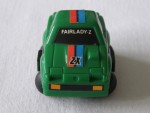 | Massstab | 1:68 |  schwarze Aufkleber als Scheiben mit weissem Aufdruck "Fairlady Z" auf der Frontscheibe und Jalousie in Wagenfarbe als Heckfenster. Verzerrte Karosserie. Über dem ganzen Auto ein blau-rot-schwarzer Aufkleber mit dem Aufdruck "ZX" auf  der Motorhaube. Schwarzer Aufkleber als Stossstangen. Kolorierte Rücklichter als Aufkleber mit dem schwarzen Aufdruck "300 ZX". Einfaches Plastikspielzeug mit schwarzen Kugelräder und Pull-Back-Antrieb