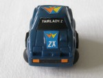 | Massstab | 1:68 |  schwarze Aufkleber als Scheiben mit weissem Aufdruck "Fairlady Z" auf der Frontscheibe und Jalousie in Wagenfarbe als Heckfenster. Verzerrte Karosserie. Auf der Motorhaube ein blau-weiss-orange-gelber Aufkleber mit dem Aufdruck "ZX". Auf dem Dach ebenfalls ein blau-gelb-oranger Aufkleber mit Pfeilspitzenmuster. Schwarzer Aufkleber als Stossstangen. Kolorierte Rücklichter als Aufkleber mit dem schwarzen Aufdruck "300 ZX". Einfaches Plastikspielzeug mit schwarzen Kugelräder und Pull-Back-Antrieb