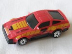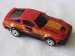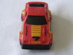 | Massstab | 1:58 |  schwarze, nicht durchsichtige Scheiben und angedeutete Targa-Dächer. Kotflügelverbreiterungen und Rückspiegel an der A-Säule angebracht in Wagenfarbe. Schwarzer Schweller und Frontstossstange. Kunststoffkarosserie und verschraubte, farblose Metallbodenplatte. Auf der Motorhaube ein gelber Streifen mit der gelb-schwarzen Aufschrift "Good Year Nissan" sowie die schwarze Startnummer 7. Auf den Seiten ein gelber Streifen, ein schwarz-weisser Aufdruck "Good Year Moroso" und die schwarze Startnummer 7. Im Heck eine 4-eckige Öffnung für den Abstossschlüssel als Aktion. Chrom-8-Steg-Felgen mit Gummi-Reifen. Fahrzeug aus der Burning-Key Car Serie als "Flsh-Back" mit einem roten 3-achsigen Truck als Abschussbasis-Garage
