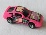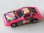 | Massstab | 1:60 |  schwarze, nicht durchsichtige Scheiben und angedeutete Targa-Dächer. Rückspiegel in Wagenfarbe an der A-Säule angebracht. Auf der Motorhaube ein gelb-pink-grün-schwarzer Aufkleber mit dem Aufdruck "Super Stock Wheels". Auf den Seiten ein schwarz-pink-grün-gelber Aufkleber mit dem Aufdruck "Wheels Super Stock" und die Startnummer 28. Auf dem Dach ein gelb-pink-schwarzer Aufkleber mit der Startnummer 28. Mittig in der Bodenplatte eine klebrige breite Rolle, die das leichte Kunststoff-Auto an einer Wand runterfahren lässt. Chrom-8-Loch-Felgen mit Hartplastikräder. Fahrzeug aus der Super-Stock Wall Clingers Serie