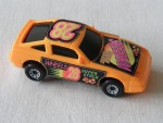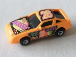 | Massstab | 1:60 |  schwarze, nicht durchsichtige Scheiben und angedeutete Targa-Dächer. Rückspiegel in Wagenfarbe an der A-Säule angebracht. Auf der Motorhaube ein gelb-pink-grün-schwarzer Aufkleber mit dem Aufdruck "Super Stock Wheels". Auf den Seiten ein schwarz-pink-grün-gelber Aufkleber mit dem Aufdruck "Wheels Super Stock" und die Startnummer 28. Auf dem Dach ein gelb-pink-schwarzer Aufkleber mit der Startnummer 28. Mittig in der Bodenplatte eine klebrige breite Rolle, die das leichte Kunststoff-Auto an einer Wand runterfahren lässt. Chrom-8-Loch-Felgen mit Hartplastikräder. Fahrzeug aus der Super-Stock Wall Clingers Serie