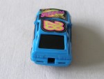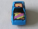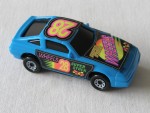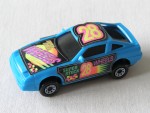 | Massstab | 1:60 |  schwarze, nicht durchsichtige Scheiben und angedeutete Targa-Dächer. Rückspiegel in Wagenfarbe an der A-Säule angebracht. Auf der Motorhaube ein gelb-pink-grün-schwarzer Aufkleber mit dem Aufdruck "Super Stock Wheels". Auf den Seiten ein schwarz-pink-grün-gelber Aufkleber mit dem Aufdruck "Wheels Super Stock" und die Startnummer 28. Auf dem Dach ein gelb-pink-schwarzer Aufkleber mit der Startnummer 28. Mittig in der Bodenplatte eine klebrige breite Rolle, die das leichte Kunststoff-Auto an einer Wand runterfahren lässt. Chrom-8-Loch-Felgen mit Hartplastikräder. Fahrzeug aus der Super-Stock Wall Clingers Serie