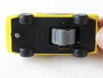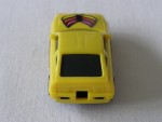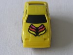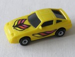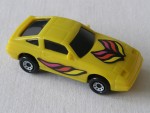 | Massstab | 1:60 |  schwarze, nicht durchsichtige Scheiben und angedeutete Targa-Dächer. Rückspiegel in Wagenfarbe an der A-Säule angebracht. Auf der Motorhaube und den Seiten ein schwarz-gelb-rot-pinker Flammenaufkleber. Mittig in der Bodenplatte eine klebrige breite Rolle, die das leichte Kunststoff-Auto an einer Wand runterfahren lässt. Chrom-8-Loch-Felgen mit Hartplastikräder. Fahrzeug aus der Super-Stock Wall Clingers Serie