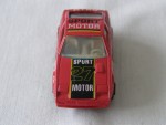 | Massstab | 1:60 |  bläuliche, durchsichtige Scheiben und cremefarbiges Linkslenker-Interieur. Schwarze Kunststoffbodenplatte-Heckstossstange-Einheit. Auf der Motorhaube schwarz-gelber Streifen mit dem Aufdruck "Sport Motor" und der Startnummer 27. Auf den Seiten schwarz-gelber Streifen und dem weiss-schwarzen Aufdruck "Sport Motor Auto" und der Startnummer 27. Auf dem Dach und der Heckklappe den schwarz-weiss-gelben Aufdruck "Sport Motor Auto". Chrom-8-Steg-Felgen im Schaufelrad-Design und Hartplastikräder. Welly Produkt aus der Diamond-Wheels Serie