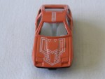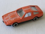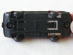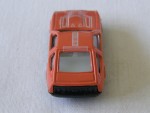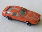 durchsichtige Scheiben, weisses Interieur. Schwarze, vernietete Plastik-Bodengruppe-Stossstangen-Einheit. Auf der Motorhaube und dem Dach weisses Streifenmuster. Schwarze Scheibenräder mit Chromzierring und Hartplastikräder. Sehr einfaches Kinderspielzeug als Die-Cast |