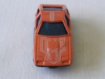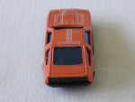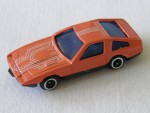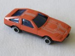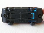 dunkelblaue, nicht durchsichtige Scheiben. Schwarze, vernietete Plastik-Bodengruppe-Stossstangen-Einheit. Auf der Motorhaube und dem Dach weisses Streifenmuster. Schwarze Scheibenräder mit Chromzierring und Hartplastikräder. Sehr einfaches Kinderspielzeug als Die-Cast |