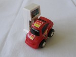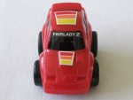 | Massstab | 1:55 |  schwarze, nicht durchsichtige Scheiben und verschaubte Kunststoff-Bodenplatte, mit verzerrter Karosserie, ähnlich den Choro-Q Modellen. Auf dem ganzen Auto rot-orange-gelb-schwarze Streifen als Aufkleber. Auf der Frontscheibe den schwarz-weissen Aufklebr mit dem Aufdruck "Fairlady Z". Im Heckboden ganz hinten ein Aufklapp-Metallhebel für die Aktion. Weisse 5-Doppelsteg-Felgen mit Gummi-Reifen und Pull-Back-Antrieb. Tankstelle mit Aktionbeschrieb in Japanisch ist vorhanden