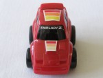 | Massstab | 1:55 |  schwarze, nicht durchsichtige Scheiben und verschaubte Kunststoff-Bodenplatte, mit verzerrter Karosserie, ähnlich den Choro-Q Modellen. Auf dem ganzen Auto rot-orange-gelb-schwarze Streifen als Aufkleber. Auf der Frontscheibe den schwarz-weissen Aufklebr mit dem Aufdruck "Fairlady Z". Im Heckboden ganz hinten ein Aufklapp-Metallhebel für die Aktion. Weisse 5-Doppelsteg-Felgen mit Gummi-Reifen und Pull-Back-Antrieb. Tankstelle mit Aktionbeschrieb in Japanisch ist vorhanden