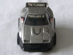 | Massstab | 1:48 |  schwarze, nicht durchsichtige Scheiben, Bodengruppe, Stossstangen und Frontspoiler einer verzerrten Karosserie. Auf der Motorhaube ein schwarzer Streifen. Auf der Frontscheibe ein schwarz-weisser Aufkleber mit der Aufschrift "Fairlady Z". Auf dem grossen Heckspoiler ein schwarz-weiss-roter Kleber mit der Aufschrift "V 6 Turbo". Auf den Seiten ein ein weiss-rot-schwarzer Streifenaufkleber. Kolorierte Rückleuchten als Aufkleber. Silberne 5-Steg-Original-Felgen mit Gummi-Reifen und Pull-Back-Antrieb