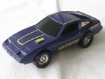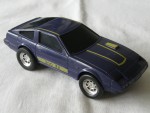 schwarze, nicht durchsichtige Scheiben. Auf der Motorhaube, dem Dach und der Turbo-Hutze gelbe Streifen. Auf den Seiten ein gelber Streifen mit der dunkelblauen Aufschrift "300 ZX". Kolorierte Rückleuchte. Chrom-8-Steg-Felgen mit Hartplastikräder und Pull-Back-Antrieb. Ziemlich bespielt aber komplett |