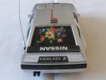 | Massstab | 1:24 |  schwarze, nicht durchsichtige Scheiben, Stossstangen, Heckspoiler mit weissem Aufdruck "Nissan" und Doppelrohr-Auspuff. Rückspiegel in Wagenfarbe an der A-Säule angebracht. Auf der Motorhaube und dem Dach ein rot-schwarzer Streifen mit dem schwarzen Aufdruck "300 ZX Turbo". Auf den Seiten ein schwarzer Streifen mit dem Aufdruck "Fairlady Z 300 ZX Turbo". Kolorierte Lichter bei geschlossenen Klappscheinwerfern und mit der schwarz-weissen Aufschrift "Fairlady Z" als Nummernschild. R/C Antenne hinten links angebracht. Batteriebetriebens Funkfernsteuer-Fahrzeug. Weisse 5-Steg-Original-Felgen mit Profilgummi-Reifen und lenkbaren Vorderrädern