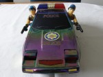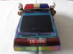 | Massstab | 1:13 |  schwarze, nicht durchsichtige Scheiben. Rückspiegel in Wagenfarbe an der A-Säule angebracht. Aufgesetzter Heckspoiler und aufklappbare Klappscheinwerfer. Auf der Motorhaube und den Seiten blau-gelb-rote Aufkleber mit dem Aufdruck "Patrol". Auf der Motorhaube zusätzlich ein rotes "Scanner-Licht" (wie KITT). Auf der Frontscheibe den roten Aufdruck "Police". Auf dem Dach eine rot-blaue Lichtbar. Aus den Seitenfenster ragen zwei bewaffnete Polizisten. Auf dem Heckspoiler den schwarzen Aufkleber mit dem Aufdruck "Nissan Turbo". Als Nummernschild den rot-weissen Aufkleber mit dem Aufdruck "ZX 300". Kolorierte Lichter. Batteriebetriebenes Fahrzeug mit Anstossmotor. Gold-Chrom-Turbo-Felgen mit Hartplastikräder