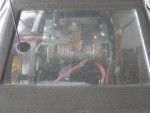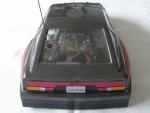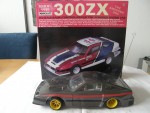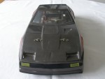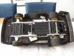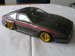fertig gebautes Fernsteuer-Auto mit gespritzter Lexanhaube in grau mit rot-schwarzem Streifen auf den Seiten und Funkantenne hinten links. Gelbe Tiefbett-8-Steg-Felgen mit Gummi-Slick-Renn-Reifen, mit Kunststoff-Chassis und Servos aber ohne Fernsteuer-Modul. Gebrauchsspuren aber vollständig mit Elektro-Antrieb |