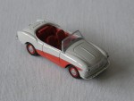 4-sitziges, offenes Convertible mit rotem Interieur. Zweifarbige Karosserie mit silbernen Elementen beim Kühlergrill, den Stossstangen und den Scheinwerfern. Kolorierte Lichter. Orange Stahlfelgen mit silbrigen Raddeckeln und Gummi-Reifen |