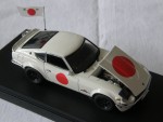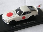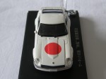 | Massstab | 1:43 |  durchsichtige Scheiben, schwarzes Interieur mit Schalensitzen, Scheibenwischern und Reserverad im Kofferraum, weisse, zu öffnende Motorhaube, mit Motorapplikation, Heckspoiler und rechter Rückspiegel an der A-Säule montiert. Verchromte, seitliche Scheibenrahmen, Stossstangen und weitere Details wie Türgriffe. Offizielles Pace-Car Einsatzfahrzeug des Circuit Wolf, einer Anime-Serie aus den 70.ern von Japan, in den Farben weiss, mit roten Kreisen und Japan-Flagge hinten Links statt Radioantenne. Kolorierte Lichter mit Glasabdeckungen auf den Scheinwerfern. Schwarze 8-Steg-Felgen mit Profilgummi-Reifen