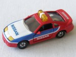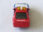 | Massstab | 1:60 |  durchsichtige Scheiben mit angedeuteten Targa-Dächer. Ohne Interieur, aber mit batteriebetriebener Aktionsbox für die Aktion mit Lautsprecher im Kofferraum. 3-Farbenlackierung. Schwarze, vernietete Kunststoffbodenplatte mit Batteriefach. Aufgesetzter, roter Heckspoiler und Rückspiegel an der A-Säule angebracht. Zu öffnende Türen. Auf der weissen Motorhaube den blauen Aufkleber mit dem Aufdruck "Nissan". Auf den Seiten und der Heckklappe den weissen Aufdruck "Nissan". Auf dem Dach eine gelbe, runde, batteriebetriebene Lichtbar. Gelbe Kunststoffscheinwerfer. Chrom-5-Steg-Felgen mit Hartplastikräder. Sondermodell des offiziellen Fuji-Speedway Pace Cars