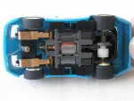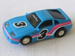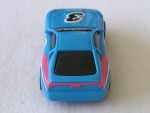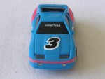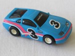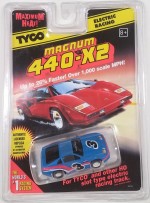 | Massstab | 1:60 |  schwarze, nicht durchsichtige Scheiben. Rückspiegel in Wagenfarbe an der A-Säule angebracht. Auf der Motorhaube ein weiss-schwarzer Kleber mit der Startnummer 3. Auf der Frontscheibe den weissen Aufkleber "Good-Year". Um das ganze Auto ein pink-weisser Streifen sowie die weiss-schwarze Startnummer 3 und Werbeaufdruck. Beleuchtete Scheinwerfer. Weisse 5-Steg-Felgen mit Weichgummi-Reifen. Auto für die H-0 Slot-Rennbahn, samt Motor. Fahrzeug aus der Magnum X-2 Serie