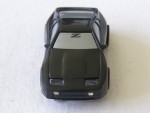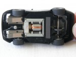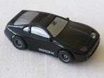 silberne, nicht durchsichtige Scheiben. Rückspiegel in Wagenfarbe an der A-Säule angebracht. Auf der Frontscheibe den schwarzen Aufdruck "Z". Auf den Seiten den weissen Aufdruck "300 ZX". Beleuchtete Scheinwerfer und kolorierte Rücklichter. Graue 5-Steg-Felgen mit Weichgummi-Reifen. Auto für die H-0 Slot-Rennbahn, samt Motor |