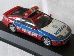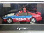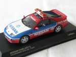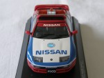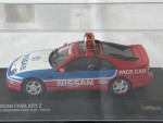 | Massstab | 1:43 |  durchsichtige Scheiben, inklusive Targa-Dächer, schwarzes Rechtslenker-Interieur inkl. Überrollkäfig, Scheibenrahmen, Scheibenwischer und Heckblende. 3-Farbenlackierung. Aufgesetzter Heckspoiler und Rückspiegel in Wagenfarbe an der A-Säule angebracht. Auf der Motorhaube den blauen Aufdruck "Nissan" sowie das Fuji-Speedway Logo und als Nummernschild den schwarz-weissen Aufdruck "Fisco". Auf der Frontscheibe den roten Balken mit weisser Aufschrift "Nissan". Auf den Seiten den weissen Aufdruck "Nissan Pace Car" und Werbeaufdrucke. Auf dem Dach eine orange Lichtbar. Auf der Heckstossstange zusätzliche Blinker. Silberne 5-Steg-Original-LM-Felgen mit Profilgummi-Reifen. Fahrzeug in der auf 1008 Stück weltweit limitierten Fuji- Pace-Car Fisco Ausgabe