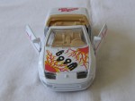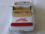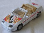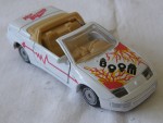 | Massstab | 1:36 |  durchsichtige Frontscheibe bei offenem Convertible mit cremefarbenem Überrollbügel Persenning und Linkslenker-Interieur. Zu öffnende Türen. Verschraubte, mit 4-Rohr-Auspuffanlage detaillierte, cremefarbene Kunststoffbodenplatte. Rückspiegel in Wagenfarbe an der A-Säule angebracht. Auf der Motorhaube rot-gelbe Flammenmuster und den schwarzen Aufdruck "Boom". Auf den Seiten ein roter Streifen mit Zacken. Auf dem Kofferraumdeckel den roten Aufdruck "Hot Blooded". Glasscheinwerfer und rote Heckblende. Silberne Scheiben-Felgen mit Gummi-Reifen und Pull-Back-Antrieb